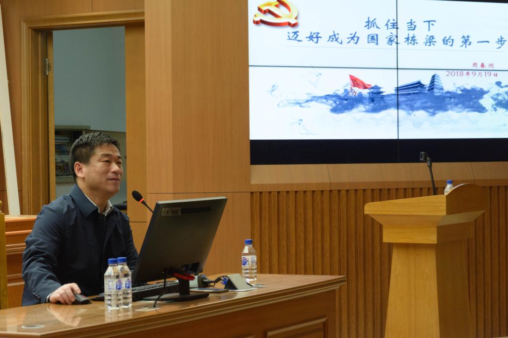 党委书记周春国老师以“抓住当下,迈好成为家国栋梁的第一步”为题讲授此次党课,为18级新生提出了八个字的“硬要求”——爱国励志,求实力行。此次党课为同学们未来的发展指出了基本的方向,点上了一盏领航灯。