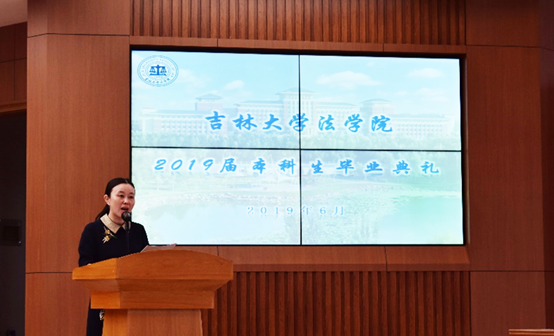 院长蔡立东为毕业生送上寄语。蔡院长首先肯定了同学们大学四年的努力与提升,还叮嘱同学们要胸怀感恩之心,做善良之人,身体力行地来践行公正法治的理念,永远不要放弃对公平与正义的追求。能够肩负使命,勇于承担,为社会、为国家做出吉大法学人应有的贡献!
