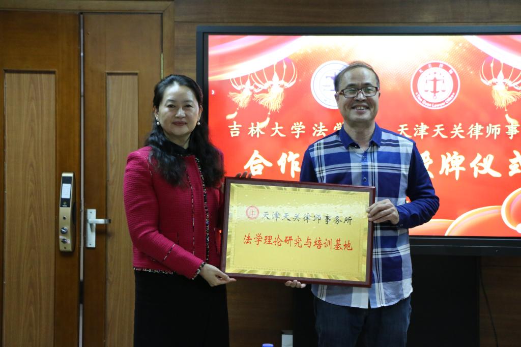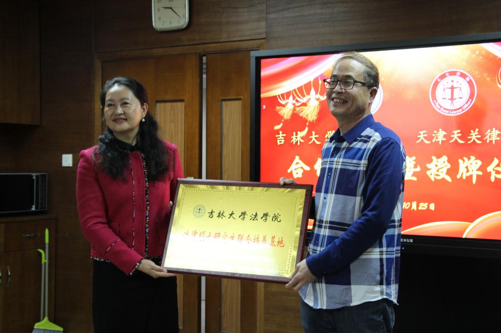 法律硕士研究生联合培养基地”和“天津天关律师事务所法学理论研究与培训基地”牌匾。