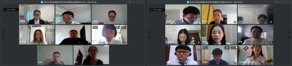 教师48人次,外请专家12人次。外请专家均由实务经验丰富、实践能力突出的法官、检察官和天津天关律师事务所、吉林全策律师事务所、吉林集成律师事务所律师担任,对法律硕士学位论文中的实践方面与实务问题进行评议,彰显了法律硕士专业型研究生的特色。答辩过程中,先由导师以各种方式介绍所指导研究生基本情况与论文写作情况,再由答辩学生详细汇报论文研究问题、研究方法、主要内容、重点难点、创新之处与研究结论等方面,最后进入问答环节,答辩学生对答辩委员会提问做出回答。在本组全部学生答辩完成后,答辩委员会进行独立视频合议,对学位论文进行投票,做出是否通过答辩的决定,并推选本组优秀论文。