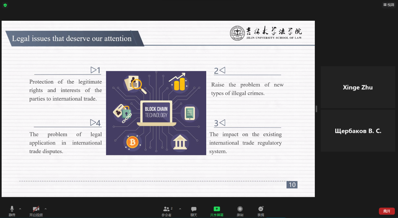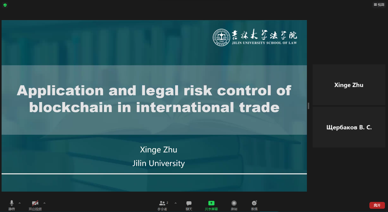 本科生朱欣格同学,以“Application and legal risk control of blockchain in international trade”为题,应邀在第四分议题“International Private Law”中作口头报告,和与会者展开讨论。她介绍了区块链技术在国际贸易中实际商业应用的经典案例,并分析了区块链技术在国际贸易领域应用中可能存在的法律风险,最后分享了自己关于这些问题的独到见解。发言结束后,朱欣格同学与其他参会者就其报告进行了热烈的交流和讨论,并回答了主持人提出的诸多问题,获得了主持人和其他参会者的称赞。
