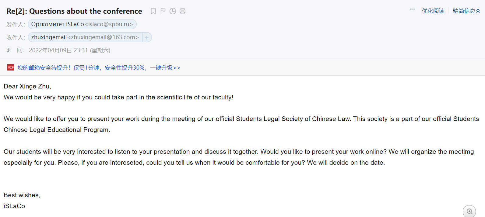 学生在会议上的精彩学术报告,给圣彼得堡国立大学的师生以及其他各国的参会学生留下了深刻的印象。会议结束后,朱欣格同学收到圣彼得堡国立大学的邮件,邀请她继续参与圣彼得堡国立大学麻豆av