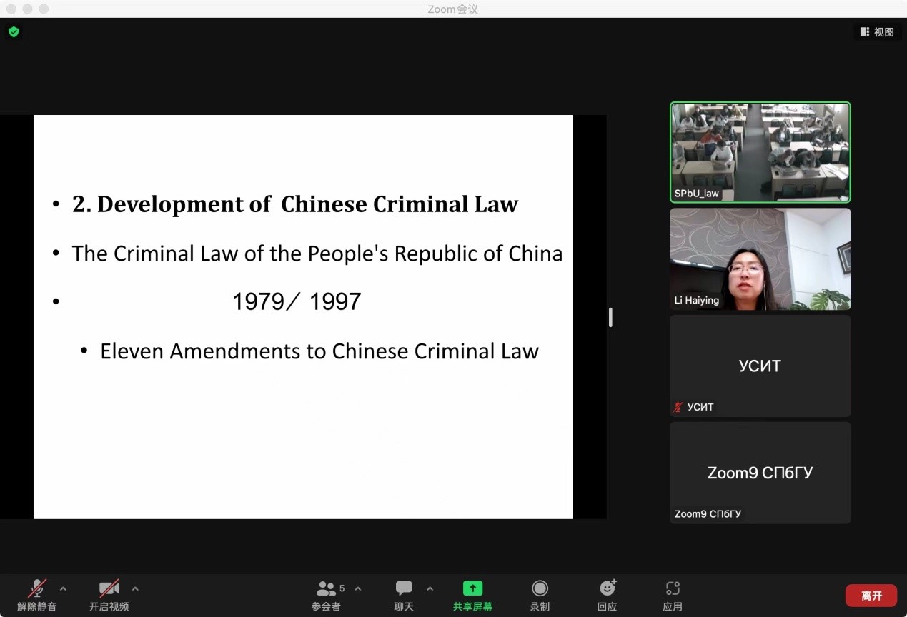 李海滢教授向圣彼得堡国立大学法律系的学生介绍了中国刑法的渊源、发展、体系与解释,解读了中国刑法学中的四要件犯罪构成理论,分析了两类法定正当行为既正当防卫与紧急避险的成立条件,包括对防卫过当、特殊防卫、避险过当的理解,同时系统介绍了中国的刑罚体系,特别是在限制死刑适用方面的制度设计。李海滢教授的授课注重理论阐释与案例分析相结合,通过深入浅出、具体生动的讲解,让外国学生更好地了解了中国刑法学的基础理论知识、中国刑法的基本规定和刑事司法的实践做法。