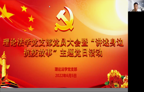 2022年6月5日,理论法学党支部召开支部党员大会暨“讲述身边抗疫故事”主题党日活动。支部大会由党支部书记刘雪斌同志主持,党支部成员宋显忠、钱大军、苗炎、侯学宾、杨帆、郑怀宇、乔楠、黄伟、杨雪参加会议。麻豆av