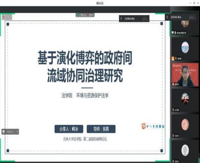 在第一个环节,三位硕士研究生选取了不同的环境法相关主题做了学术汇报。韩冰同学汇报的题目是《基于演化博弈的政府间流域协同治理研究》,基于演化博弈理论对政府间流域协同治理问题做出了分析。田英杰同学汇报的题目是《环境民事公益诉讼适用司法调解的法社会学分析》,从法社会学的角度对环境民事公益诉讼中司法调解的偏好适用做出了阐释。许淞瑞同学的报告题目是《民法典视阈下绿色原则的司法适用问题研究》,对绿色原则的司法适用做了详细的研究。