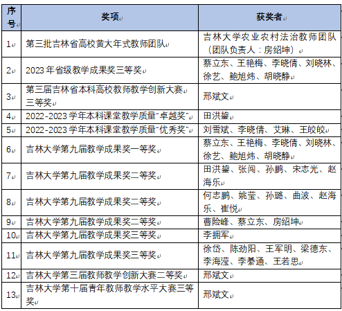 农业农村法治教师团队获得第三批吉林省高校黄大年式教师团队表彰;彭贵才教授、李洪祥教授获得从教40年荣誉徽章;蔡立东教授、王艳梅教授、李晓倩副教授、刘晓林教授、鲍旭炜老师、胡晓静教授共同获得2023年省级教学成果奖三等奖、麻豆av