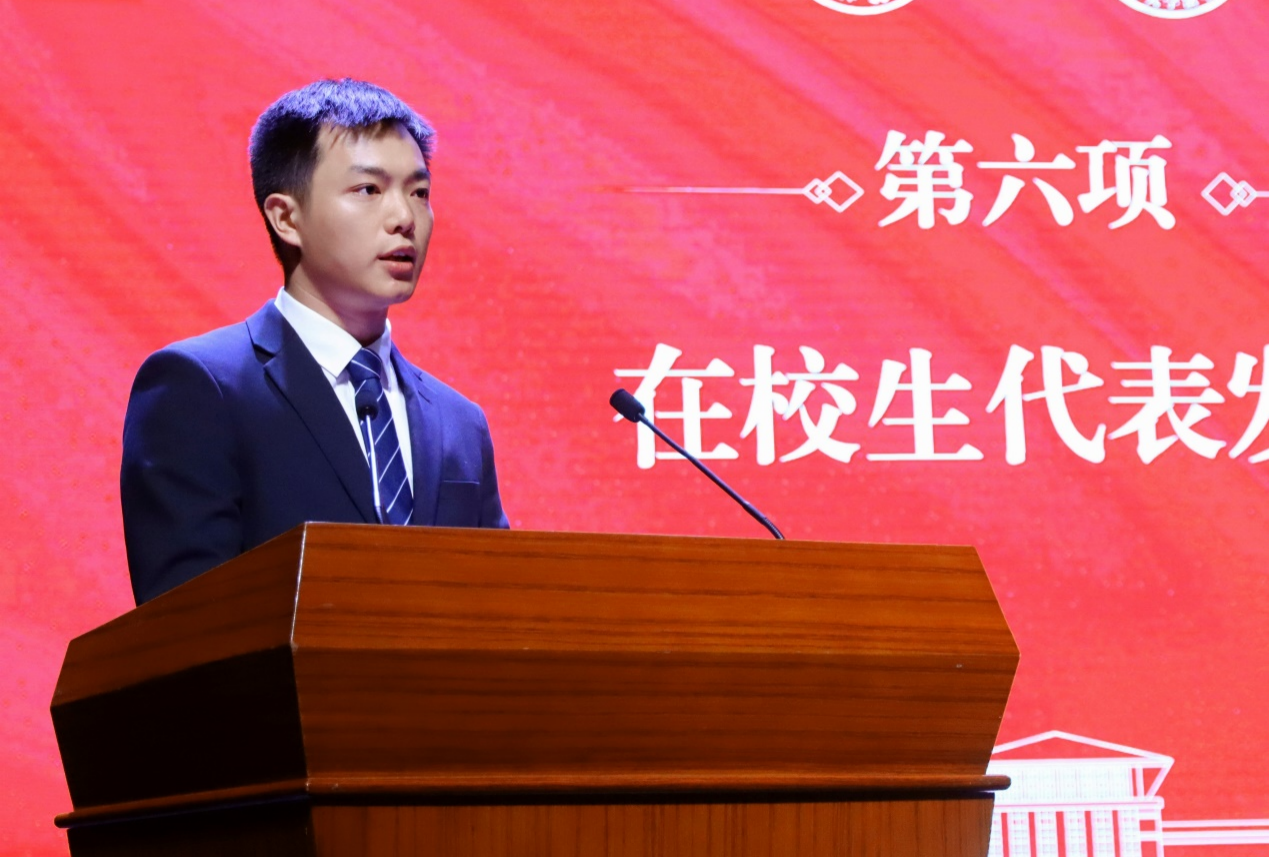 第三十四届学生会主席团成员2020级本科生陈宏钰同学和法律硕士联合会主席团成员2022级硕士研究生雷成同学分别代表毕业生与在校生发言。陈宏钰同学回顾了自己过往四年在麻豆av
