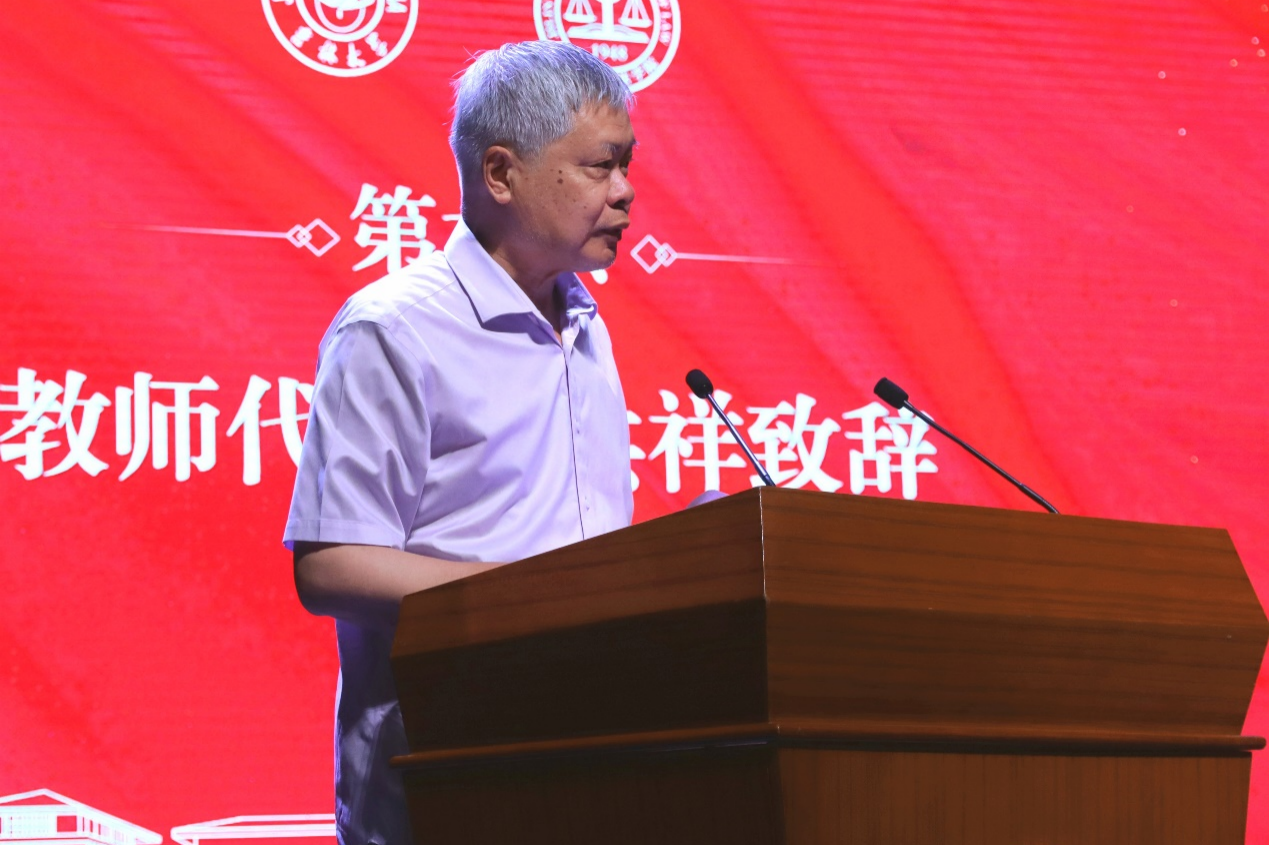 李洪祥教授以“变与不变”为主题代表教师致辞。他讲到,“变”的是时代和身份,同学们要紧跟时代步伐,与时代同频共振,即使转化思维,提升自身相应能力以适应新的身份;“不变”的是法律人公平、公正、善良、责任的初心、无论内卷躺平,都永不停歇慎思谨言的恒心、同学们心系母校,坚守院训的赤子之心以及学校、老师、父母对学生们的美好期待之心。李洪祥教授表达了对同学们“乘风破浪,扬帆启程,前程似锦,未来可期”的祝福,同时希望同学们常回家看看。