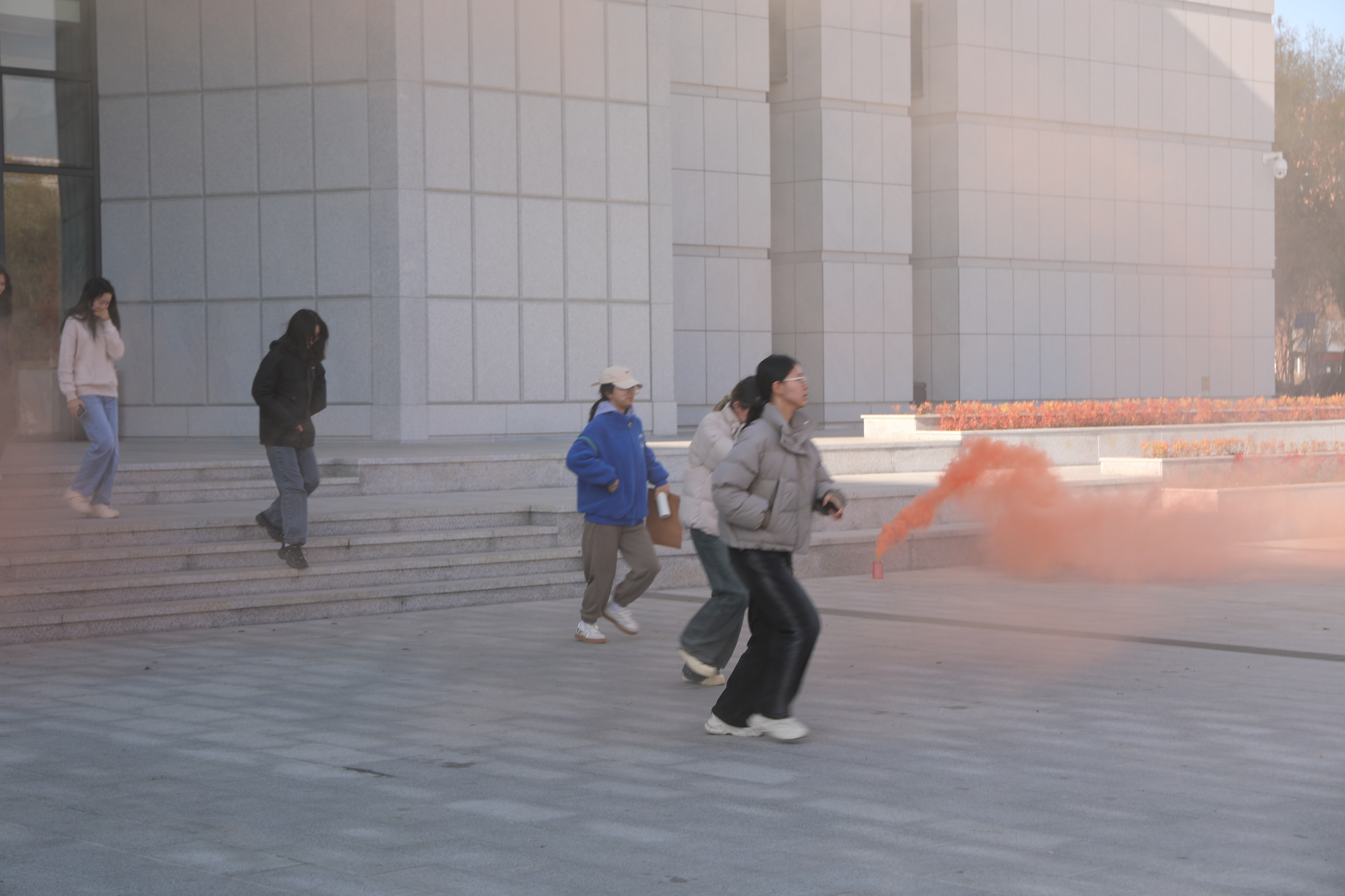 随着警报声的响起,现场滚滚浓烟,在学院老师和物业工作人员的指引下,全楼师生按照安全出口所示的方向,从楼内稳中有序迅速疏散至楼外安全地带。