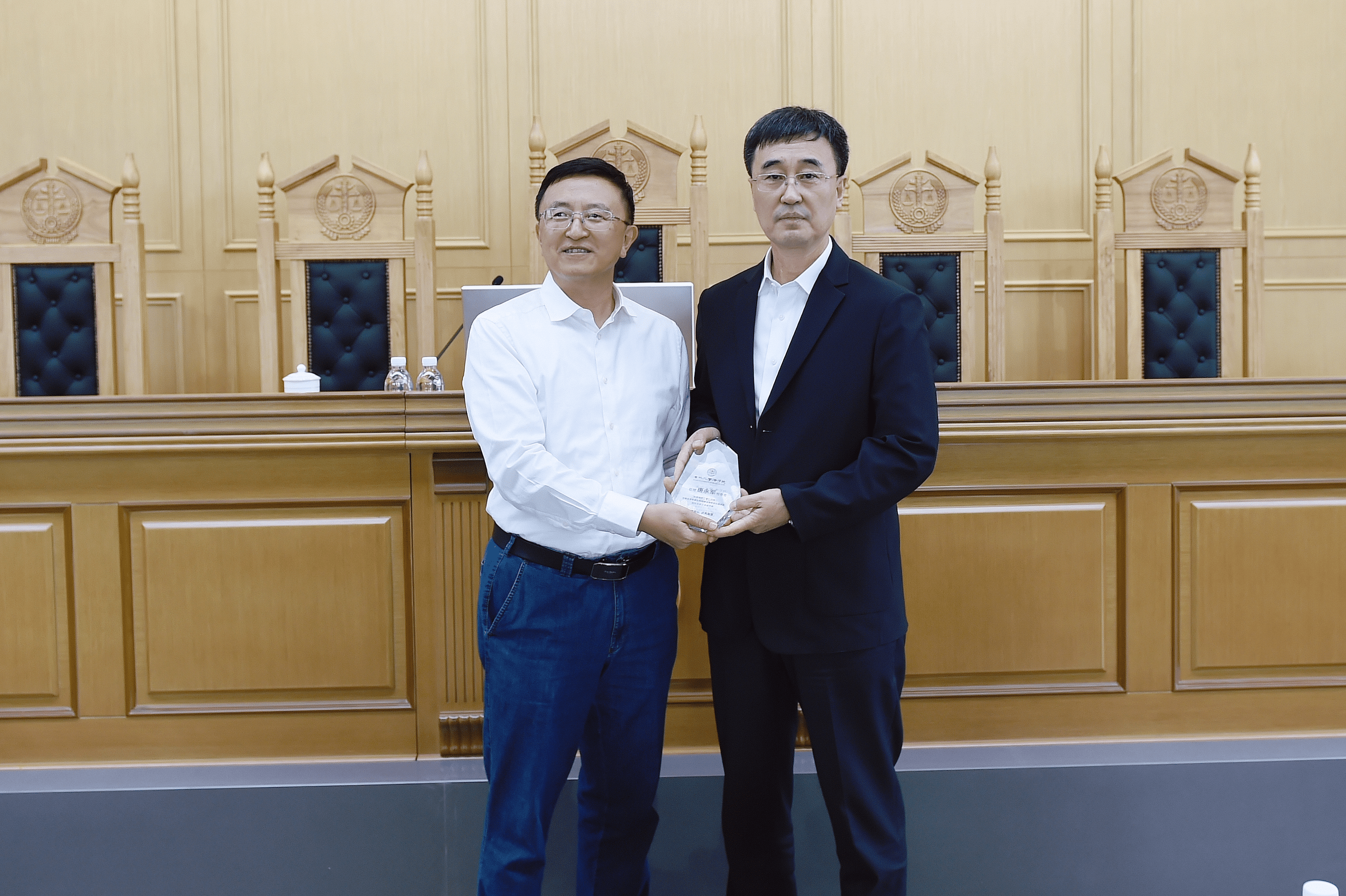 蔡立东常务副校长向唐永军常务副检察长赠送“检察实务专家进校园”讲座纪念牌