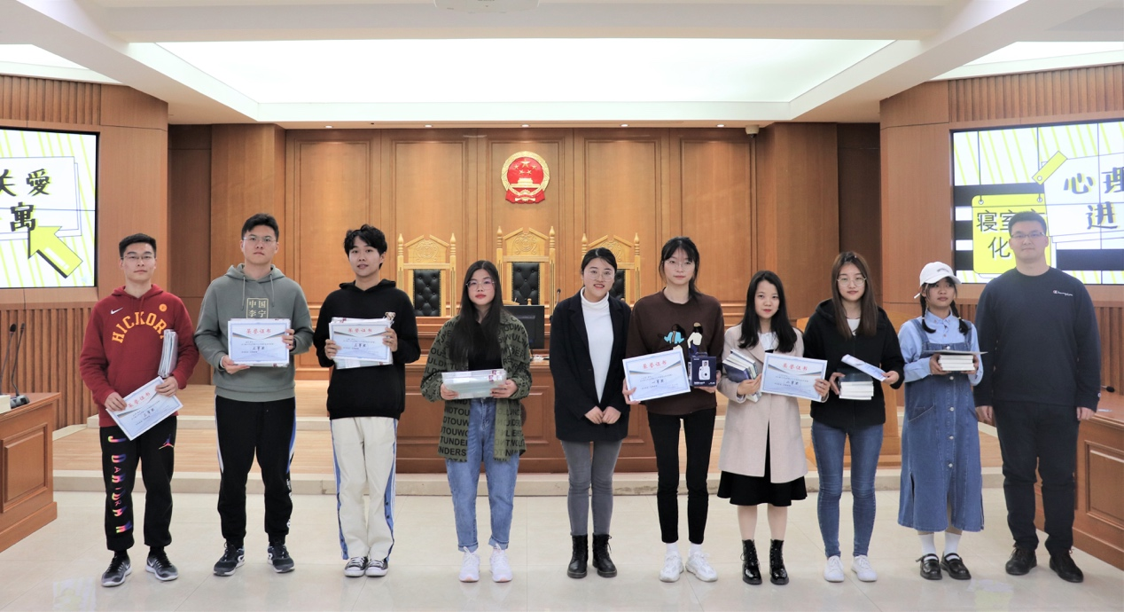 游戏环节在欢快的气氛中结束,此时,生管会负责计票的同学统计出了本次寝室文化节的获奖结果。本次活动设立一等奖一名,二等奖三名,三等奖五名。获得一等奖的寝室是:1065,获得二等奖的寝室有:1073、1077、1082、3114(并列),获得三等奖的寝室有:333、1041、1085、3112、3118。获奖结果公布后,赵昊骏老师和余丽军老师为获奖寝室颁发了奖状和奖品,并合影留念,喜悦感和自豪感洋溢在每一个获奖同学的脸上。