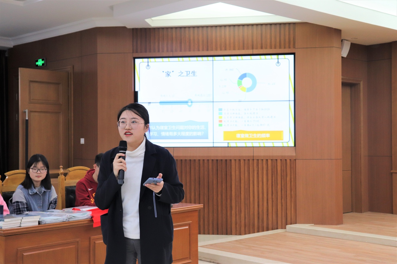 展示环节结束后,学生心理健康指导中心的余丽军老师根据活动前生管会同学收集的“寝室生活调查问卷”所统计出的数据,对统计结果进行了生动细致的讲解。余老师提出了寝室内部订立“寝室公约”的建议,以便更好地帮助同学们协调有着不同生活习惯的室友之间的关系。在谈及室友间发生矛盾该如何调解时,余老师给出了化“冷战”为“建设性争吵”的建议,她希望同学们能尽可能多地包容别人,理解别人。最后,余老师倡导同学们要尊重差异,尊重他人的人生规划,达到共同发展的目标。余老师的讲话既富有哲理又令我们感动,同学们也从中学到了很多处理室友关系、促进自身成长的好方法。