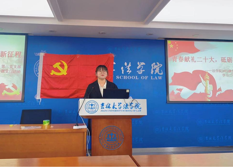 青年党员做习近平新时代中国特色社会主义思想的自觉拥护者、忠诚信仰者和忠实践行者,2022年11月23日,2022级法学硕士第二党支部、第三党支部积极响应学院号召,联合开展“砥砺奋进守初心,锐意进取谋新篇”专题党日活动,在支部内掀起学习宣传贯彻党的二十大的热潮。