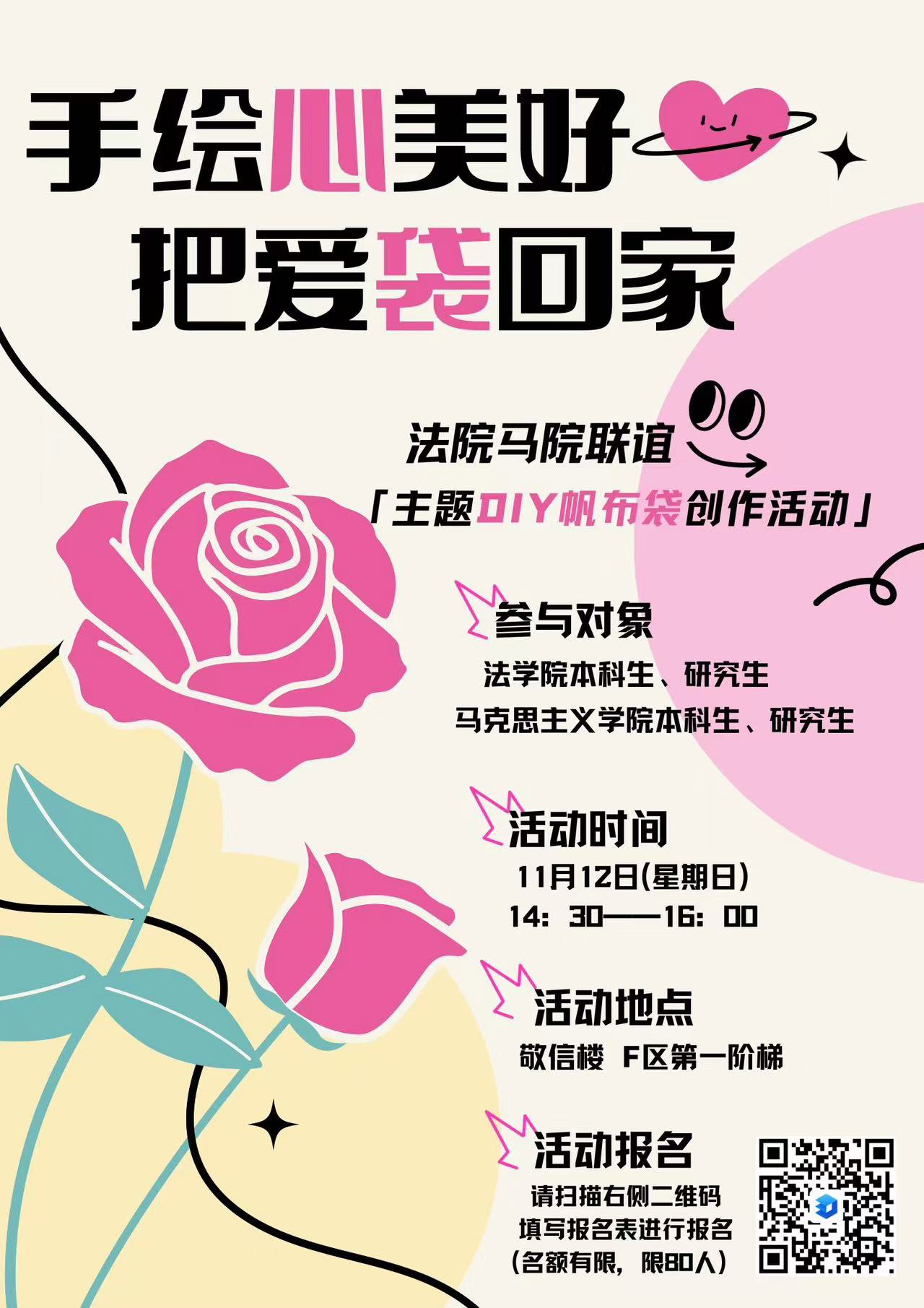 手绘“心”美好,把爱“袋”回家。本次DIY创作活动不仅帮助同学们放松了心情、缓解了压力,还搭建起了各院系、各年级间彼此交流合作的桥梁。巧手暖心,活力洋溢,祝愿广大同学借助艺术创作的过程,皆能够收获身心的快乐,为冬日增加一抹“心”的色彩!