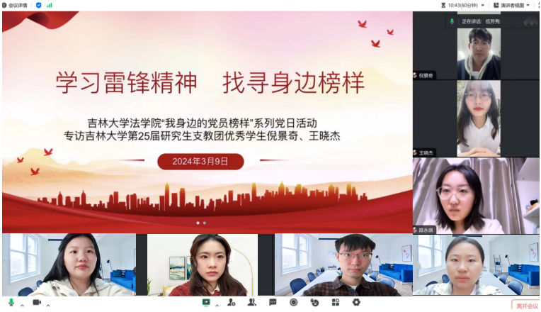 传承雷锋精神,发挥榜样力量。2023级法学硕士四个支部组建采访团队,充分挖掘身边党员榜样,号召广大研究生党员学习典型、弘扬先进,向榜样看齐。2023级法学硕士第一党支部采访到李方正、邱大钊、田欣岳三位学生党员代表。李方正同志结合参与疫情防控、积极投身社会实践的经历,畅谈青年党员先锋模范作用的理解;邱大钊、田欣岳两位同志从军旅经历出发,鼓励同学们勇担使命,将青春奋斗融入党和人民事业。第二党支部采访到学生党员石尚。石尚同志回顾入党初心,提出青年党员应珍惜当下,不断夯实专业基础、锤炼本领。第三党支部线上连线麻豆av