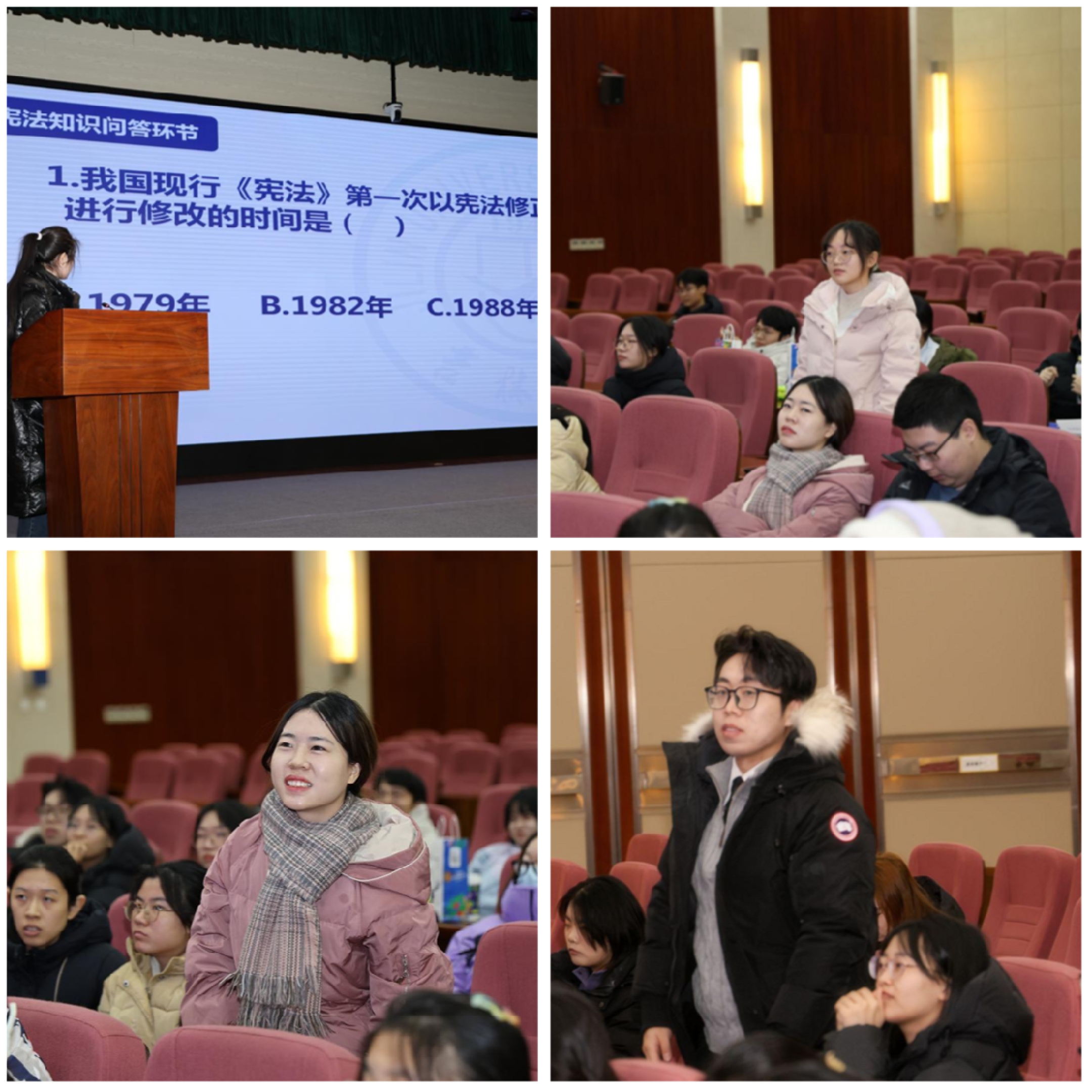 活动的高潮在宪法有奖知识竞答环节如期而至。10道选择题与10道判断题,涵盖宪法历史、基本原则、国家制度等核心知识点,题目既具专业性又富趣味性。同学们踊跃举手、沉着应答,答题声、掌声此起彼伏,在紧张激烈的互动氛围中,不仅检验了自身的宪法知识储备,展现出扎实的专业功底与良好的临场反应,更在思维的碰撞中强化了宪法意识,让法治信仰厚植于心。