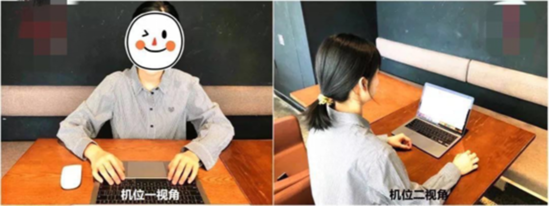 1. 远程视频复试考生端采用双机位。主机位放置电脑(包含摄像头、麦克风、外放音箱),主机安装阿里钉钉软件作为远程视频复试平台,复试过程中保持复试平台全屏幕显示状态。副机位放置智能手机,安装腾讯会议软件作为环境监测平台,并调至静音;手机置于考生侧后方1-2米处,须全程清晰显示考生复试环境和主机位屏幕,考生应准备手机支架,防止抖动以免影响复试效果。考生需提前下载和测试好软件,确保正常使用。如下图: