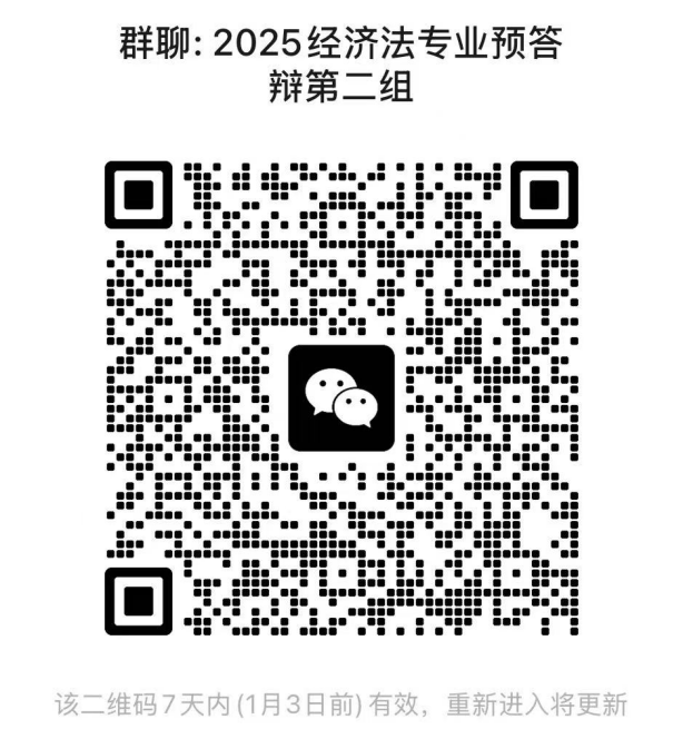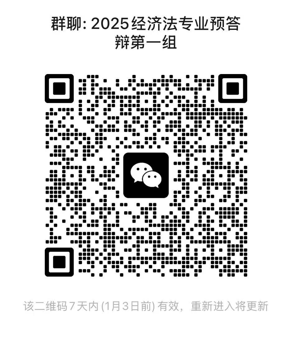 三、预答辩对象:经济法学专业老师指导的博士研究生和2023级硕士研究生;博士研究生需已完成培养计划的全部课程,通过博士学位论文开题,完成博士学位论文初稿,并经导师审阅同意后,方可申请参加本次预答辩。请参加本次预答辩的同学扫码入群。(具体分组名单见附件)