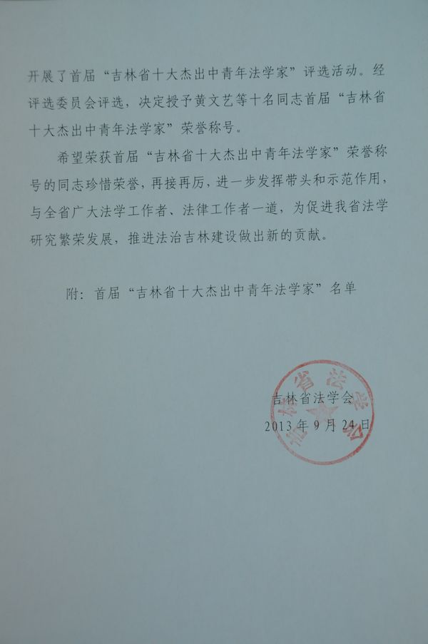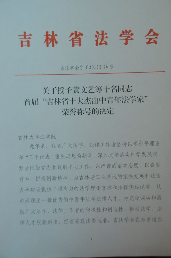 经评选委员会评选,吉林省法学会于2013年9月24日作出《关于授予黄文艺等十名同志首届“吉林省十大杰出中青年法学家”荣誉称号的决定》。麻豆av