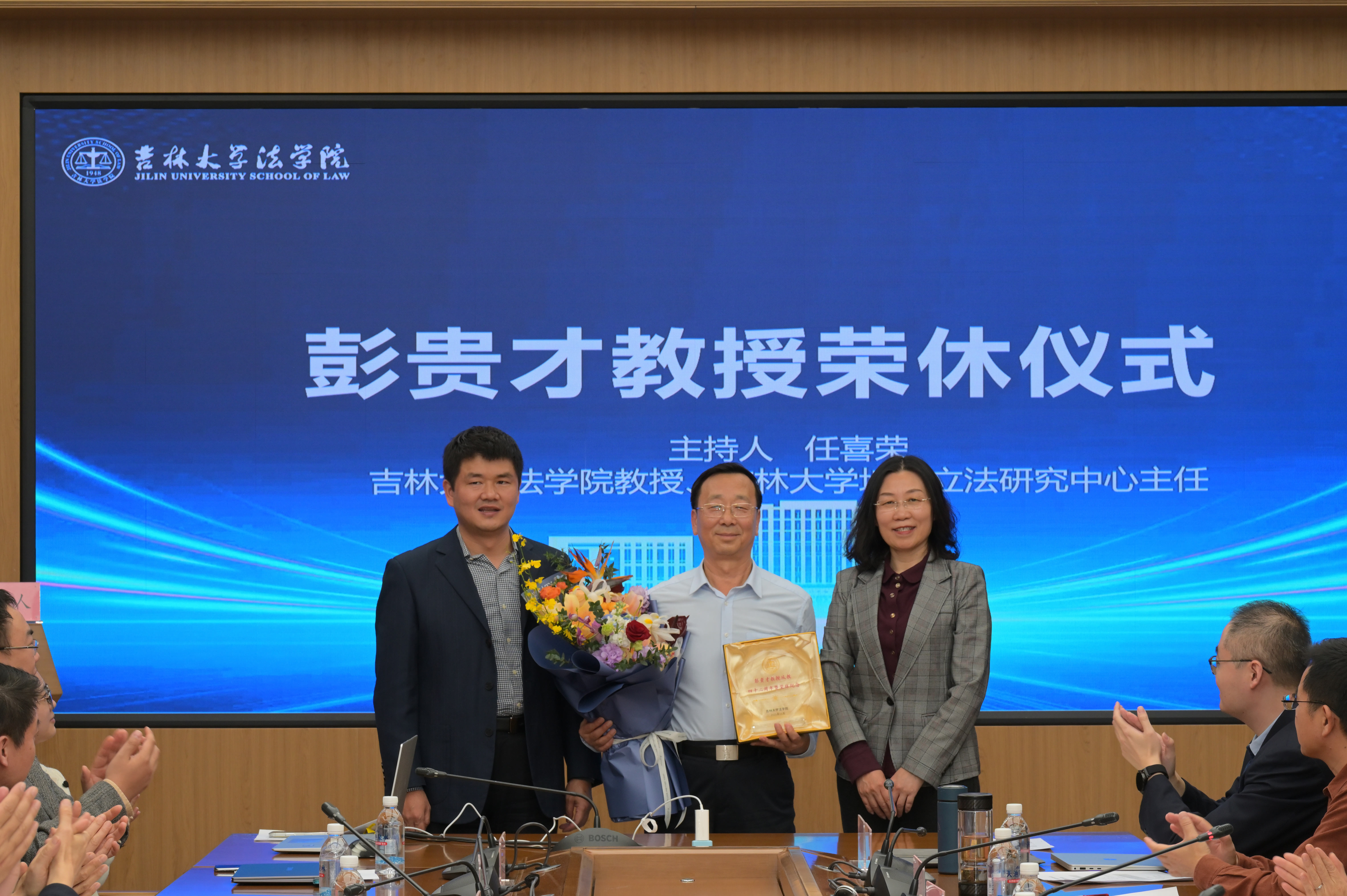 院长张闯回顾了学生时代以来,与彭老师二十余年亦师亦友的深厚情谊,希望老师的学术思想与人生理念能通过学生持续传播,祝愿老师继续为地方法治建设发挥贡献。彭贵才教授对向各位与会嘉宾表示感谢,提出退休后仍将为学院、学校还有社会继续服务的意愿,并围绕此次会议主题指出营商环境的地方立法保障仍然是亟待解决的理论实践难题。在荣休仪式最后,张杰书记和谢登科副院长向彭贵才教授送上荣休纪念牌和鲜花并合影留念。