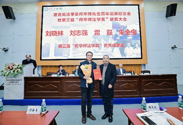朱全宝教授一同获得法学研究优秀成果奖。刘晓林教授线上发表了获奖感言并对何华辉先生在学术研究、人才培养等方面的杰出贡献表达了诚挚敬意。