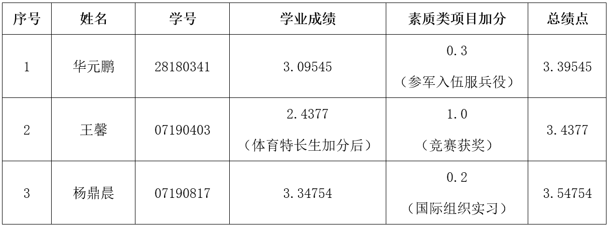 根据学校相关规定及有关部门的认定,华元鹏、王馨、杨鼎晨等三位同学获得素质类项目加分,现将具体情况公示如下: