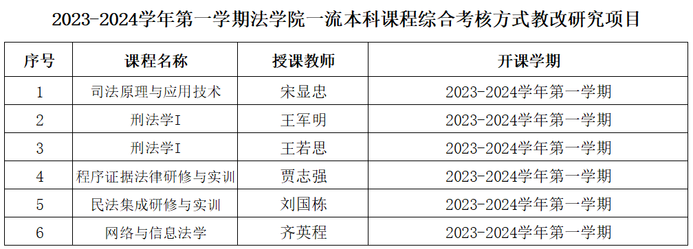 为进一步更新教育教学观念,改进教学方法,全面考核学生的知识、能力和综合素质,经授课教师总结,专家组评审,拟确定2023-2024学年第1学期《司法原理与应用技术》等6门课程结项,现予以公示。