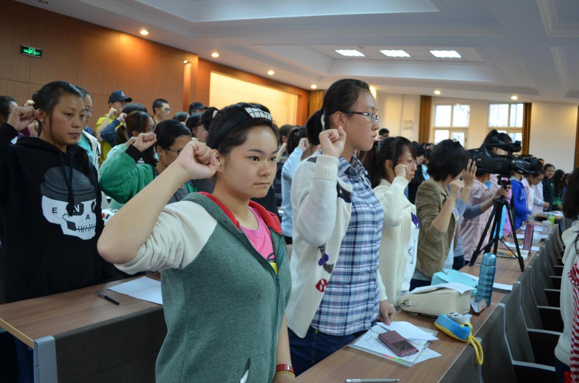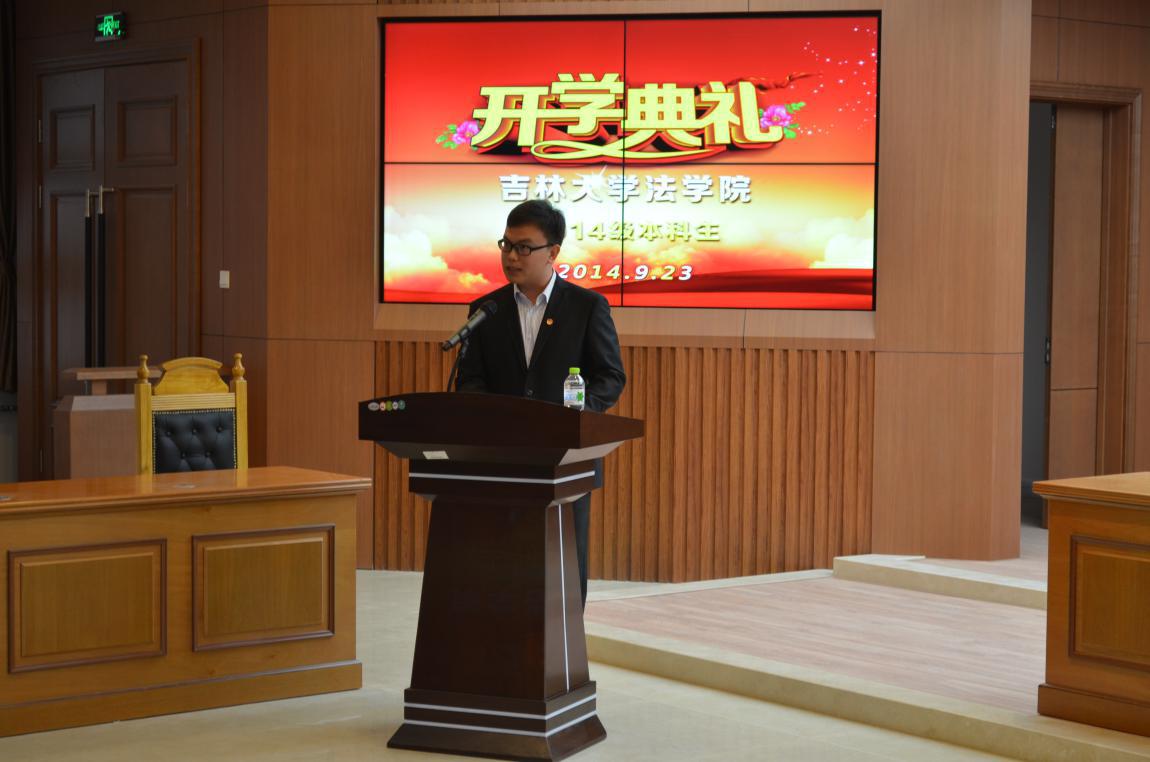 的新同学表示欢迎和祝贺,并结合自己已经走过的大学生活向同学们提出了几点建议和心得。最后他号召新同学们能够真正将个人利益与国家利益相结合,将自身梦想与民族梦想相融洽,践行公平正义的原则,做一个合格的法律人。 典礼第四项,由赵洁老师介绍了2014级各个班级的带班领导和导师,然后,2014级2班带班老师谢登科代表教学老师发言。他简单的介绍了多年来从事法律工作的心得体会,并强调了熟练掌握法学专业知识的重要性。同时砥砺大家不要浪费时间,要在大一时就树立自己的人生信念和职业规划,将知识学透学精,以至灵活运用,才能适应社会发展的需要。 典礼第五项,由孙学致教授领誓,全体新生庄严宣誓:“我志愿献身法律事业,热爱祖国,忠于人民践行法治理念,捍卫法律尊严。挥正义之利剑,持公平之天秤。积人文之底蕴,昌法治之文明。让正义的阳光照耀我们,让公平与正义永驻心间。”崇高肃穆的宣誓词回荡在三教五阶。 最后,麻豆av