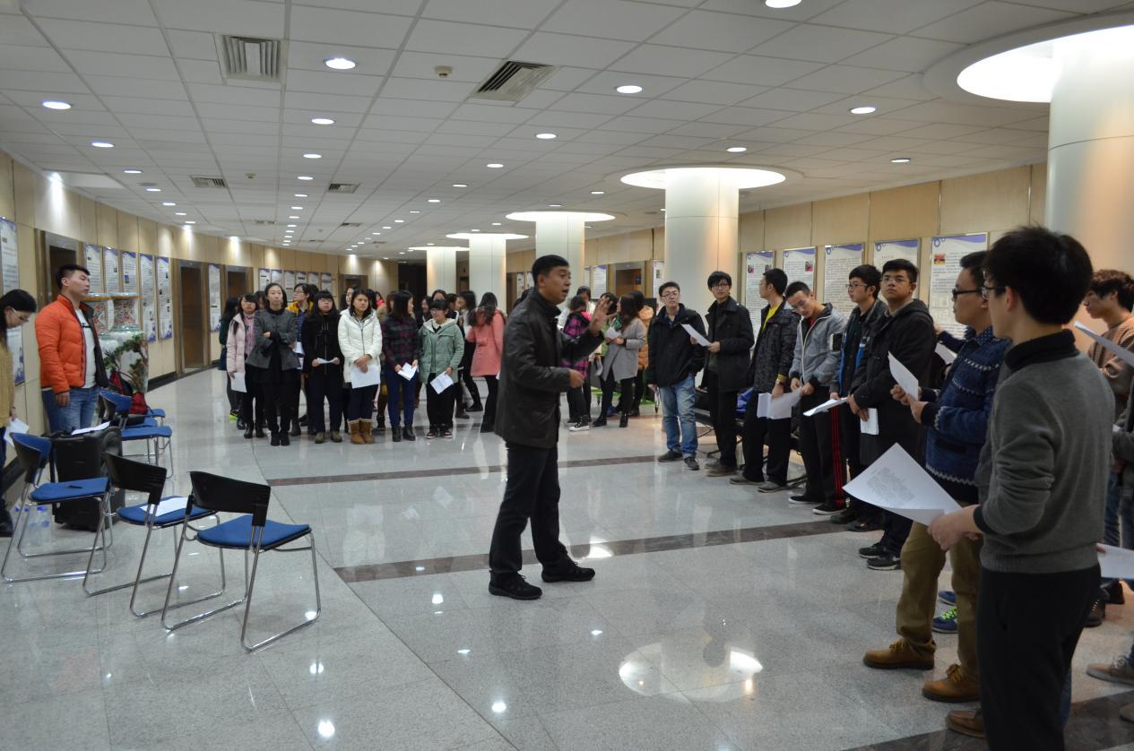 6点15分左右,全部参与人员就已经就位,党员们积极务实的态度可见一斑。2013级党支部书记骆旷达老师也亲临现场,与大家并肩奋斗。6点30分,在完成了签到及分发歌词后,排练正式开始。为了提供专业的指导,学院专门请来了艺术学院音乐合唱教师黄澈老师为合唱队做专门培训。