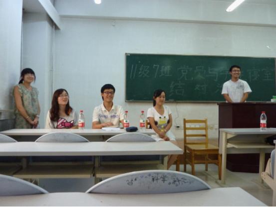 新学期伊始,为贯彻落实生管会发起的“党员与学生寝室结对”活动,促进10级与11级同学的情感交流与相互帮持,2010级7班党员和2011级7班全体同学组织开展了新学期首次班会。