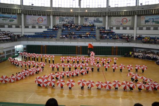 队伍于第八个出场,近百名女同学自信昂扬,一出场便吸引了全场的目光。红白相间的伞在她们的手中和着音乐的旋律翩然舞动,而后撑开的伞似桃花飞舞,带来十足的青春气息。她们踩着节拍,从“十字花”到“菱形”再到“蛋卷” ,每一次队形的变换都迅速整齐。而最后的“法”字队形更是向所有人完美诠释了麻豆av
