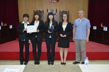 这是一场没有硝烟的战争,这是一次重塑自我的历程。三十二支队伍,四月备战,五月出征,六月决战模拟法庭。最终,2014年6月15日晚18时2014年“英特尔”模拟法庭春季赛决赛在文科实验楼模拟法庭打响,进入决赛的“四是而非”代表队以及“法律探索者”代表队构成了此次模拟法庭决赛刑事附带民事诉讼的原被告双方。合议庭由审判长李广军法官、审判员孙学致教授和陈劲阳副教授组成。