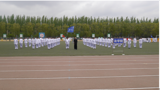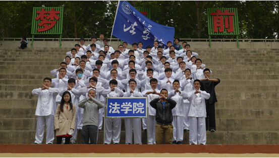 。”随后他们整齐划一,喊着“宪法民商,法院荣光。纵横四海,威震八方。”的口号跑向赛场。乐声响起,苦练了半个多月的动作如行云流水般流畅。尤其是大跃步前穿,弓步顶肘等几个动作,一黑数白,式正招圆,起于腿,发于腰,传于肩,顺于肘,达于手,精神饱满,在碧绿的操场上形成了一道亮丽的风景线。最后集合时,所有人飞快地集合成方阵,喊着响亮的口号跑步退场。
