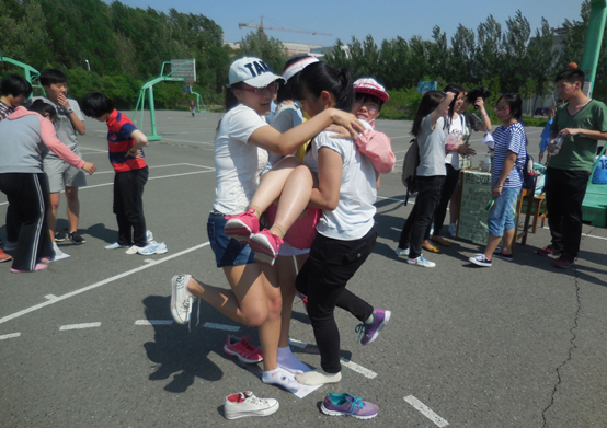 虽然骄阳似火,气温高达三十多度,但是同学们都全身心地投入到比赛当中。即使汗流浃背,脸上的笑容却依旧灿烂。“四人五足”中绑在一起的脚、并在一起的肩、挽在一起的手,还有一起喊的向前跑的口号,都让小小寝室中四个人的身上迸发出无限的力量来。“抢滩登陆”中,每个寝室都各出奇招,除了脚尖点地相互扶持、四个人紧紧抱在一起等常规方法,更有一个人完全承受三个室友的重量背起室友这种高难度的组合。但是无论哪种方法,在坚持的10秒钟,每一个人都是在为寝室的荣誉而战。