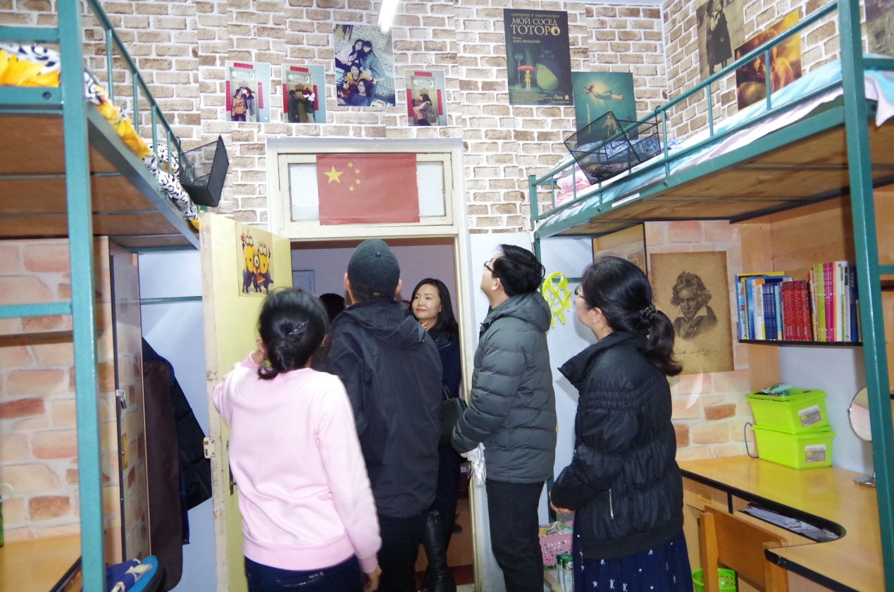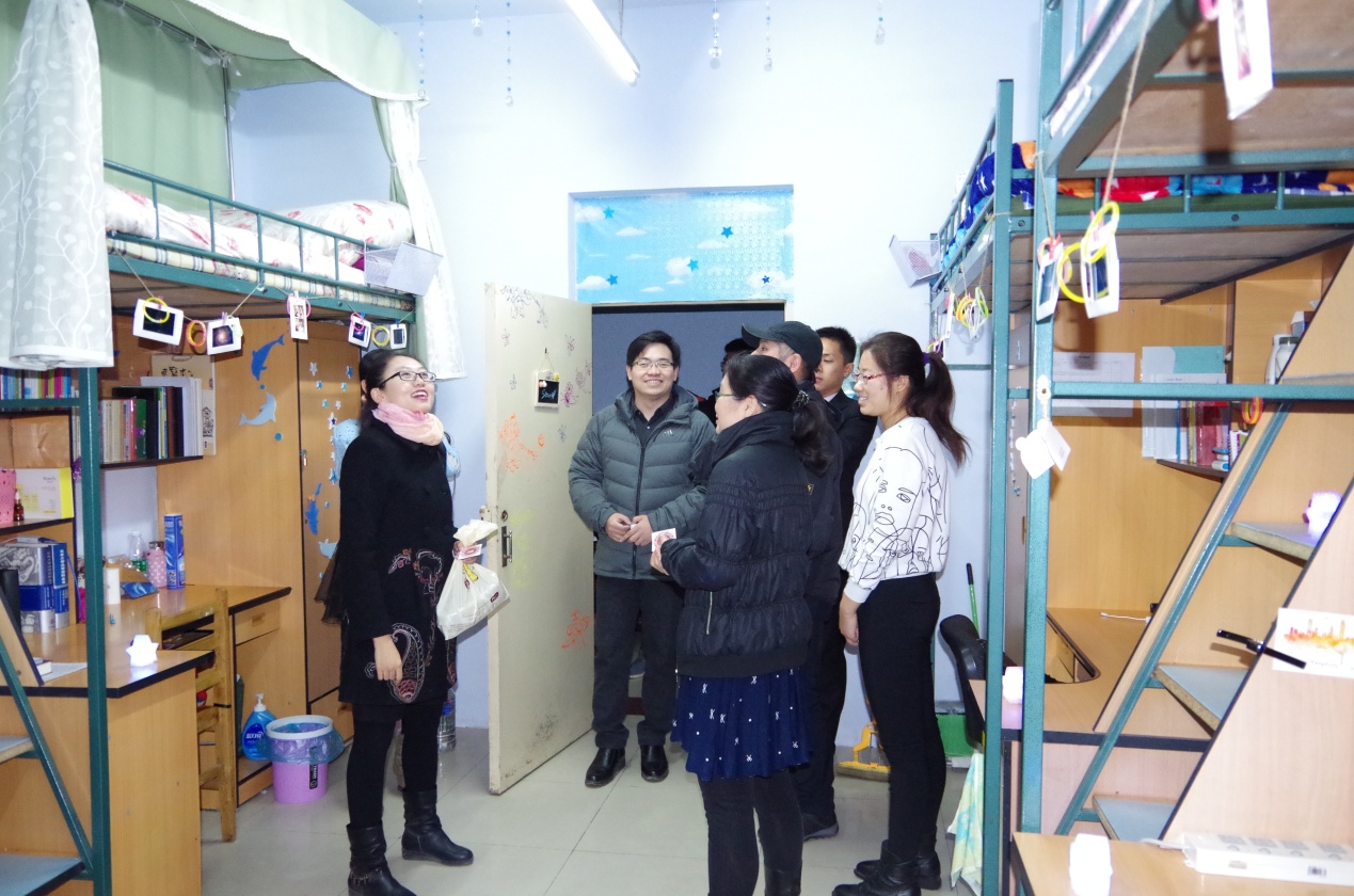 的男生寝室,随后又参观了三公寓的女生寝室。为了迎接此次活动,同学们可谓使出了浑身解数,在男生公寓,有的同学在房间内贴满了动漫人物的海报,带来浓浓的二次元氛围;有的同学在门上贴上门神,挂上中国结,一派古香古色;有的同学在天花板贴上夜光贴纸,为大家带来一片星光。少数民族的同学们还为老师们献上哈达,并送上别具民族风格的钥匙扣来欢迎老师;而在女生寝室,女生们心灵手巧,有的在墙壁上绘出大树等装饰物,有的贴起了有趣的对联……同学们更用精彩的节目欢迎老师们,如二胡表演、舞蹈表演,向大家展示寝室独特的风格,获得了老师们的赞赏。老师们细心欣赏同学们的寝室装扮,听取讲解,不时与同学们交流,使活动现场笼罩在和谐温馨的氛围中。