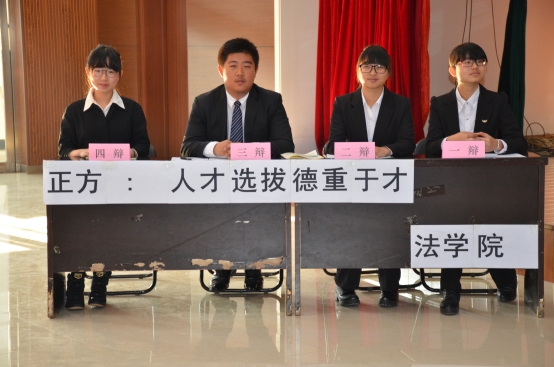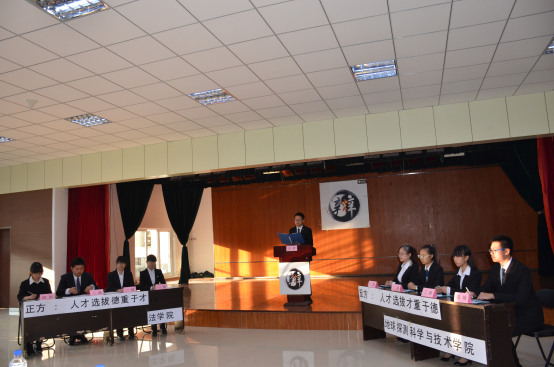 代表队是本场正方,他们的观点是人才选拔德重于才,反方为地球探测科学与技术学院,他们认为,人才选拔才重于德。本次比赛有幸邀请到了文学院的白杨教授、建设工程学院的王如生副教授、哲学社会学院的杨晓老师、护理学院的梁冰老师和药学院的高海成老师作为评委。