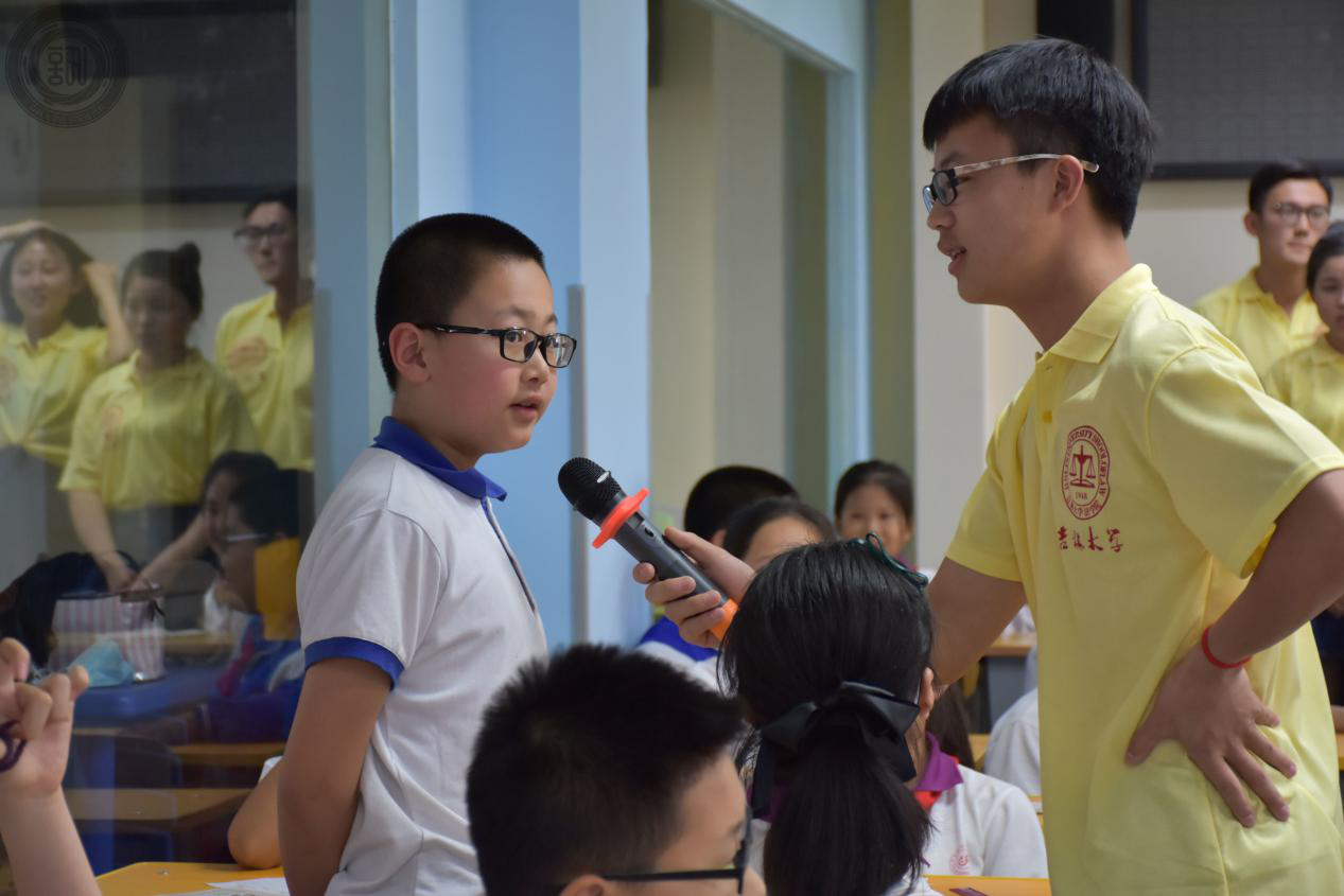 2015级的徐坤同学和贺章洪同学担任主讲人。首先,法学会的工作人员们先为在座的同学们放映了精心准备的普法动画小短片,通过观看小朋友们最喜欢的动画片的形式来激发大家对于本次普法讲座的兴趣。在观看动画小短片的时候,同学们聚精会神,不时还被动画人物逗得大笑,使得讲座现场的氛围轻松愉悦。在看完小动画之后,主讲人开始引出本次讲座的主题“向小学生普及相关的法律知识”。根据动画小短片的内容,主讲人徐坤提出了三个小问题“我们能不能跟爸爸妈妈的‘熟人’离开”、“小女孩的爸爸妈妈外出远门了,她应该由谁照顾”、“假如同学们在学校被不良少年用暴力胁迫而写作业怎么办”。小朋友们思考之后,十分积极踊跃地凭借自己的认识和想法去回答问题,其中不乏精彩的答案。随后,主讲人以专业的法律知识,指出具体的法律条文,逐一为同学们解答了上述问题,而同学们也报以了热烈的掌声。