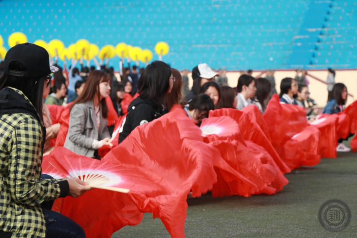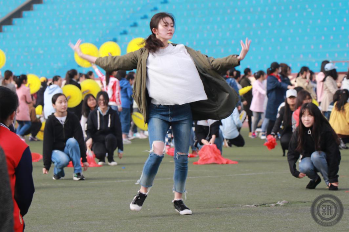 在一次又一次的练习中大二同学逐步发现了大一同学存在着道具使用方面的问题,于是不厌其烦地反复示范指导,力求舞蹈效果能更好。训练持续近一个小时,同学们虽然有些疲惫但整体效果确有提高,相信同学们能在此次运动会上取得优异的成绩。