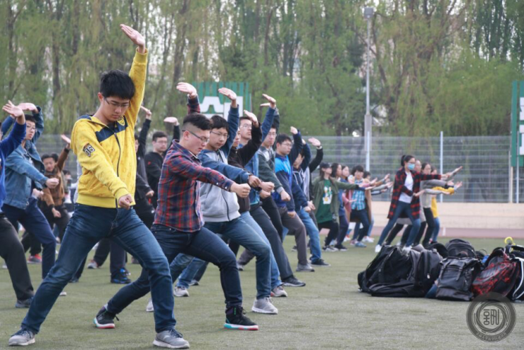 早训开始,大一的同学们按排列好的方阵队形站好,等待大二同学安排早训内容。因为在此前的训练中,太极的一整套动作都已由大二同学教授完毕,今天安排的早训内容主要是纠正每个动作的细节,训练整齐度,以及熟悉太极的音乐,跟上口令。