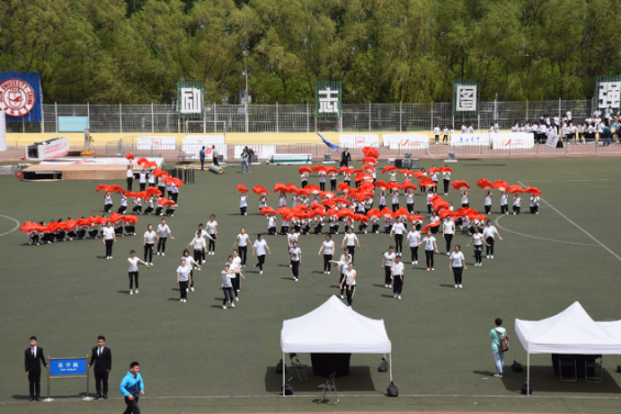 的口号,整齐地跑步进入场地,迅速的站好了相应队形。音乐响起,队员们迅速散开,排成10*10的方队,伴随着音乐舞动手臂。随着柔美的音乐响起,30位领舞进入场地,伴着音乐摇曳起舞。队员们不时变换队形,从5个方阵变换为花瓣队形,动作整齐又迅速,场边观众不时给予激烈的掌声。随着领舞的动作暂停,队形快速转变,变为三条横线的波浪队形。红色的波浪迎风舞动,散播着青春的朝气。队员们旋转舞动,挥动扇子,把大学生阳光活泼,奋发向上的精神面貌淋漓尽致地展现出来。最后,音乐进入尾声,队员们快速跑动队形,摆成了法字队形。红色的法字在绿茵场摆开,既代表了法院学子的青春朝气也体现了吉大学子的昂扬向上。大舞结束之后,同学们迅速集合,一起迈着整齐的步伐退场,赢得了阵阵掌声。