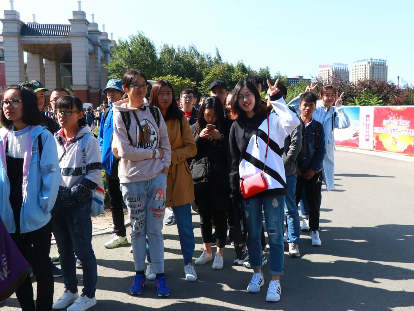 2017级新生在大学城集合列队,准备参观校园风光。