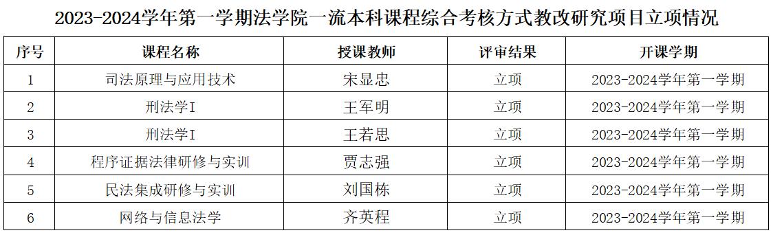为进一步更新教育教学观念,改进教学方法,全面考核学生的知识、能力和综合素质,经授课教师申报,专家组评审,确定2023-2024学年第一学期《司法原理与应用技术》等6门课程立项