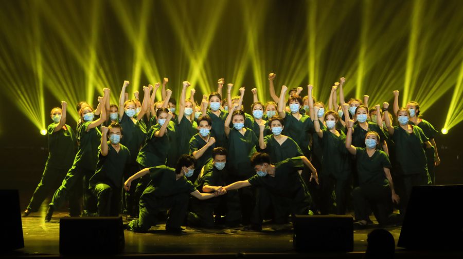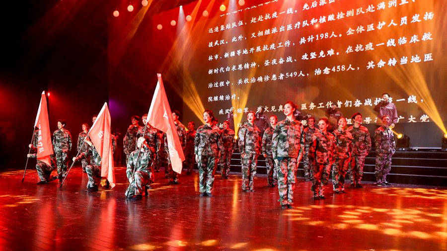 第四篇章《屹立东方》表现了学校秉承“求实创新、励志图强”的校训和“人比山高,脚比路长”的品质,各项事业都取得巨大的进步。《第一课》通过模拟第一节课的形式来讲述吉大特色学科的发展实绩。《疫路同心》和《龙耀东方》是根据今年吉大驰援武汉抗疫医疗队的事迹增设的节目,在真实感人的情景剧中展现出学校医务工作者勇于担当、无私奉献、为国为民的精神。一首《吉人天下》曲词激昂、声彻九霄,将现场气氛推向高潮,赢得在场观众阵阵掌声。