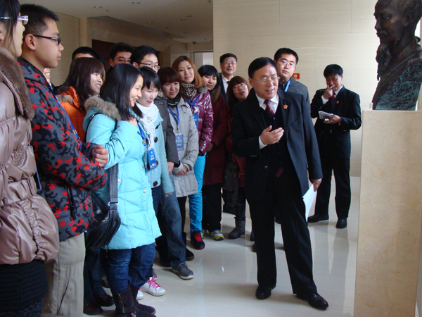 张文显院长亲切的和大家说明了情况,原来是省高级人民法院新建的审判大楼设置了法律文化长廊,在数不清的古今中外的法学家中共精心挑选了21位最有代表性著名法律人物的雕像,分三层摆放展示,他正是要对为何偏偏选出这21位法学家进行一个讲解。说着,张文显院长引导人们来到了一楼大厅法律文化长廊的马克思、列宁、毛泽东、董必武的铜塑雕像前。其中,他特别强调了将董必武列入21位法学家之中的原因,他说:“董必武是党的创始人和第一代领导人,也是其中唯一系统学过法律的,他在日本留学时学的就是法学,当时在武汉,曾是著名的大律师。建国以后,是第一任最高人民法院院长。董老的法治思想对现在和今后我国的法治建设仍有重要的指导意义。”
