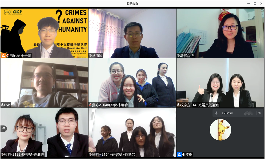 Since the announcement of "International Criminal Court Chinese Moot Court" event on November 30th, 2020, our school has attached great importance to the competition and quickly formed a team, which consists the PhD candidate in international law Wei Xiaoxu as the coach, and the international law graduate student Zhou Meng as the team leader, with JD Geng Xiaoxue, undergraduate Wu Ting, and Lin Keyu as the debaters. Geng Siwen, postgraduate of International Law, and undergraduate Huang Jingying play the role of research fellows, undergraduate Peng Zihan and undergraduate Dai Xiaohui serve as team members.