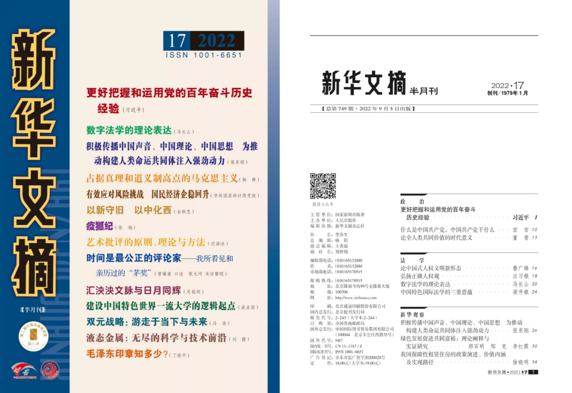 社会科学学报》2022年第3期的“论中国式人权文明新形态”一文被《新华文摘》2022年第17期全文转载,该文是鲁广锦教授致力于中国式人权文明新形态研究的阶段性成果。